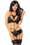 Three-Piece Ensemble: Includes a unique tie bra top, a suspender belt, and a matching thong.