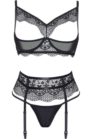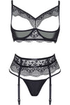 Discover the alluring elegance of the Beauty Night Chiara Set, a beautifully crafted three-piece ensemble designed to make a truly provocative statement. This set includes an open-cup, underwired shelf bra, a matching suspender belt, and a comfortable thong. The stunning black lace is both visually captivating and luxuriously soft to the touch, combining bold design with a soft feel.