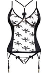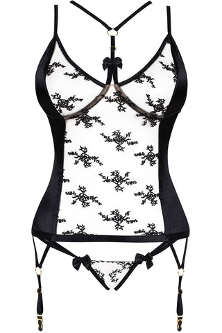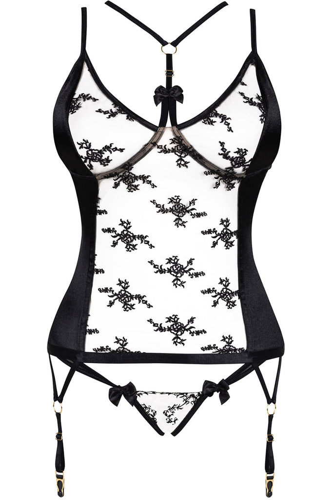 The Gianna Corset is adorned with eye-catching lacing at the back, which not only ensures a flattering fit but also exudes captivating elegance. The neckline is linked to adjustable straps with a chic decorative strap. The set is completed with matching panties featuring the same beautiful motif.