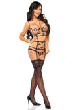 This three-piece set is designed with exceptional attention to detail. The bra is uniquely connected with straps to a matching garter belt, creating a seamless and visually striking silhouette. The garter belt is delicately laced at the back, adding an extra touch of allure and ensuring a perfect fit. The set is completed with a pair of matching panties that complement the bra and garter belt perfectly.