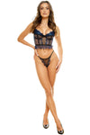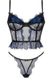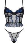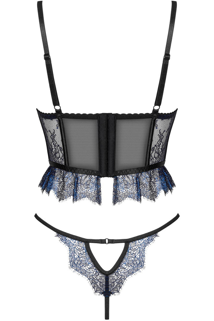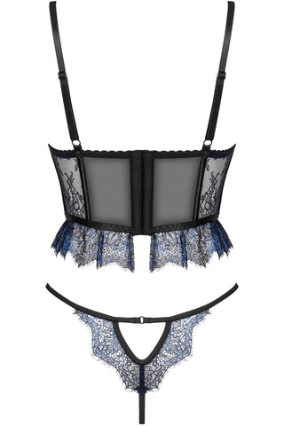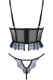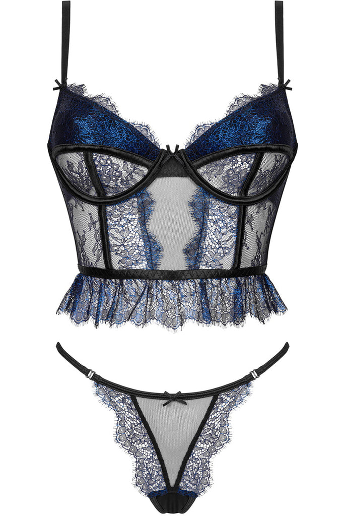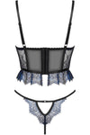 Unveil your confidence with the Beauty Night Saphira Set, an exclusive lingerie collection designed to ignite romance. This captivating two-piece features a black tulle corset and matching panties, meticulously crafted with shimmering metallic sapphire lace for an aura of sophistication and allure.