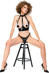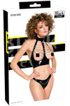 Open-Cup Top: The short, backless halterneck top features underwired open cups to perfectly frame and support the breasts. It's adorned with three decorative chains draped over each cup, adding a cool, edgy detail. The top is fully adjustable with a hook fastener at the back and a buckle fastener on each side, ensuring a perfect fit. A chest strap is attached to a ring on the collar for extra adjustability.