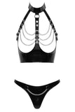 Unleash your inner rebel with the Black Level Vinyl Chain Lingerie Set, a daring two-piece ensemble that combines the sleekness of vinyl with the edgy allure of chains. This set includes an open-cup top and a matching thong, both designed to create a bold, unforgettable look.