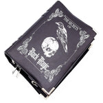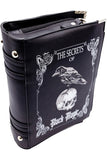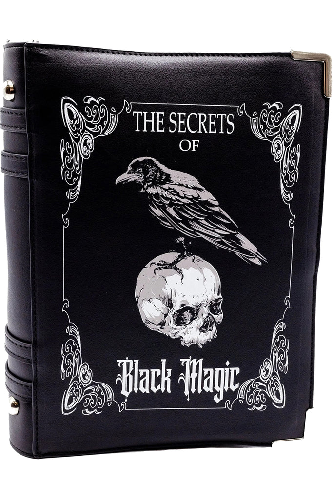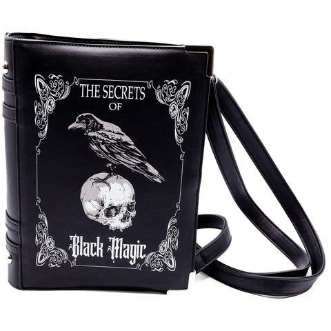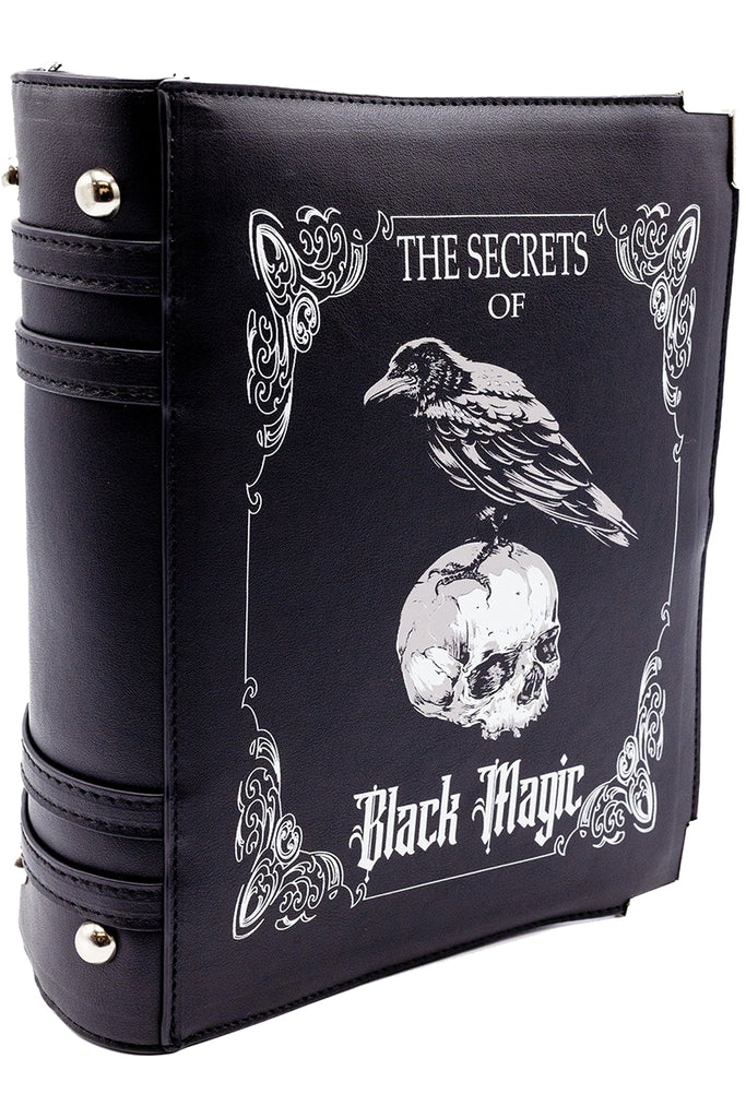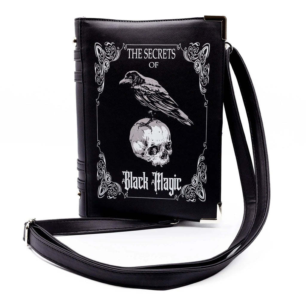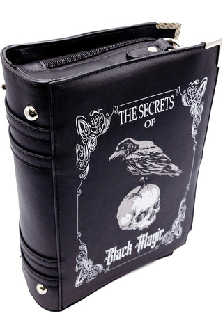 Book shaped handbag with shoulder strap featuring a white print on the front with "The Secrets of Black Magic" text and a framed Raven sitting on a skull on the front. Bag has a zip around closure.