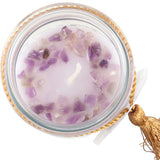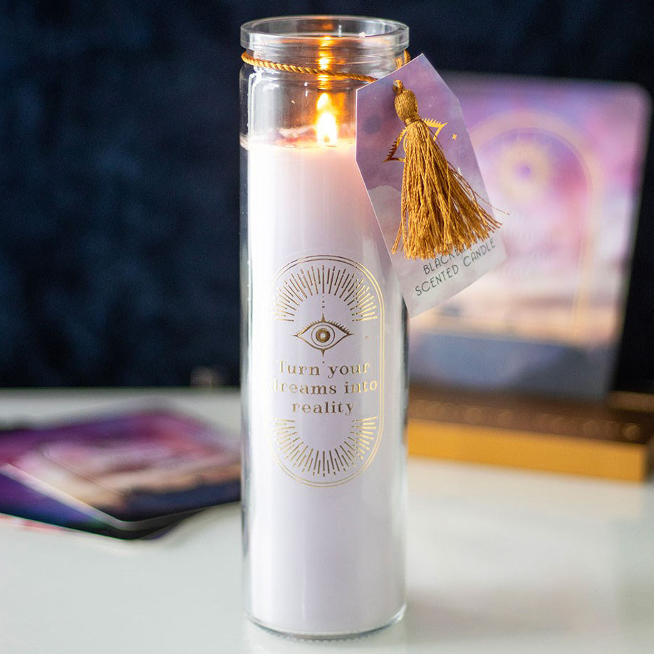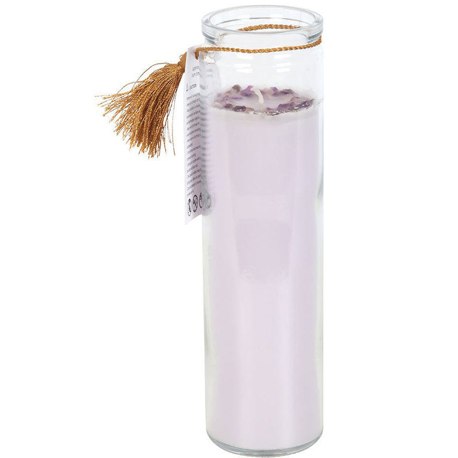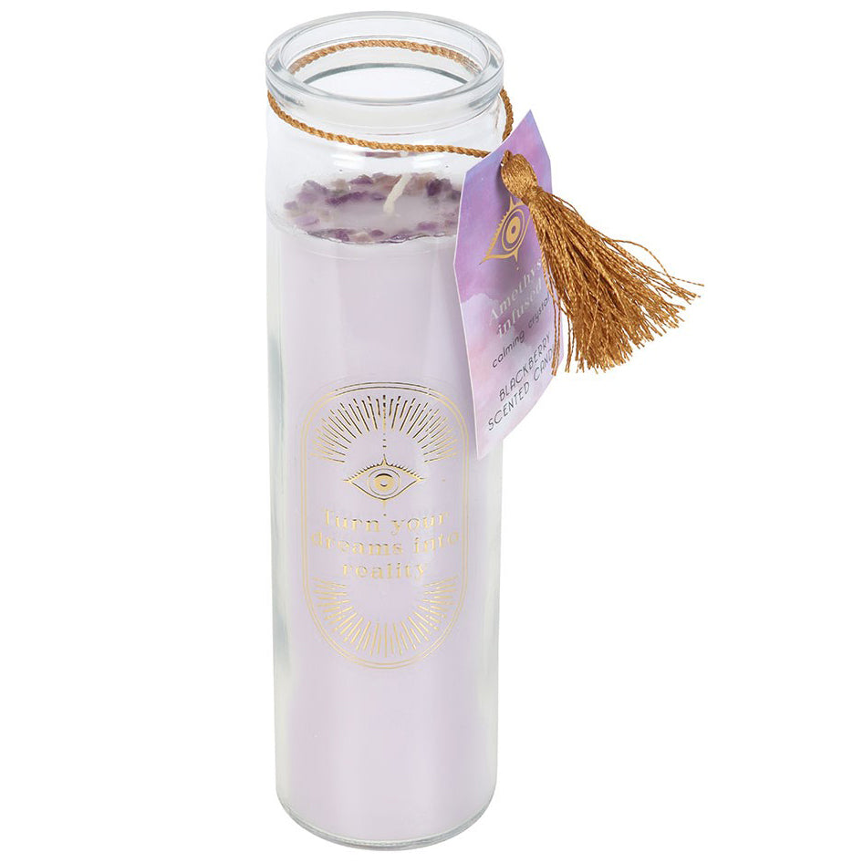 Inspired by traditional 7-day prayer candles, this tube candle comes in a beautiful blackberry fragrance. Accented with gold. Turn your dreams into a reality' text and amethyst crystal chips, this candle promotes calm and relaxation. Crystals will release from wax with use and can be reused for a multitude of spiritual purposes. Paraffin wax. Approximately 50 hours of burn time.