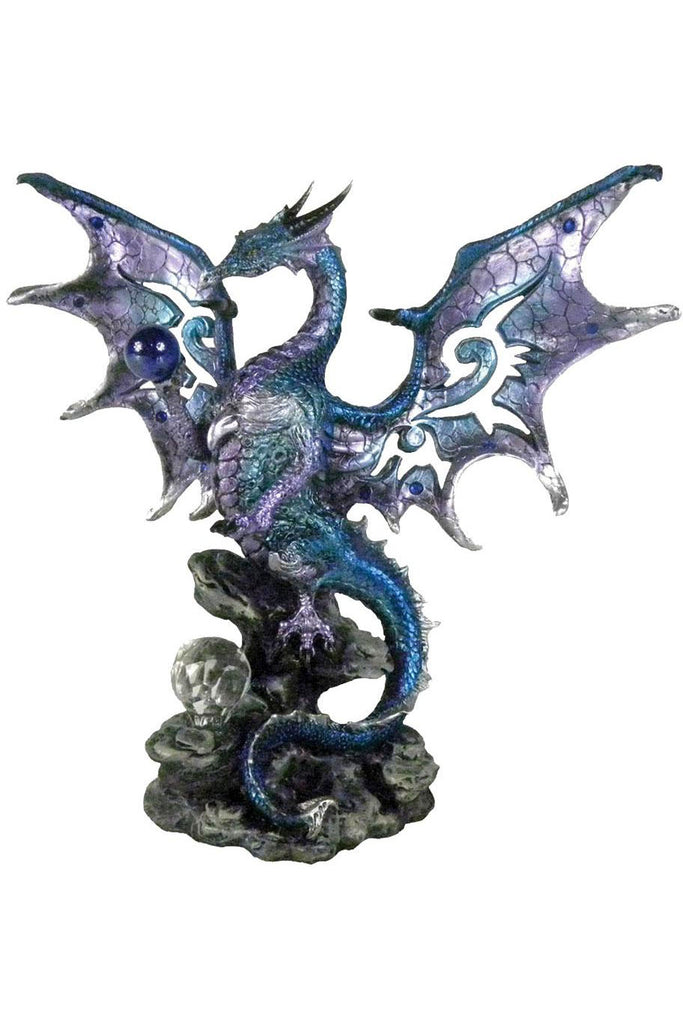 This mysterious dragon is cast in high-quality resin before being painstakingly hand-painted. Perched on a black rock, standing upright on its hind legs, this fearsome dragon is coloured in shimmering blues, greens and purples, their tail curling down below them. In their front right claw they hold a blue crystal orb which they gaze a greedily, another crystal orb on the ground below them. Their wings are outstretched, revealing the intricate patterns cut into them. Mystical and imposing at the same time, this draconic figurine adds a touch of mystery to any mantelpiece.