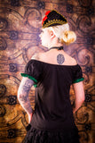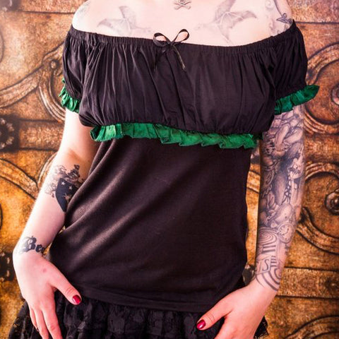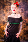 Black with Green trim off-shoulder style gypsy top with black cotton gathered section over the bust area and sleeves and black stretch viscose fabric on the back and lower section. The top has a black ribbon bow detail in the centre front of the neckline. Simple, comfortable and ideal for wearing underneath a corset!