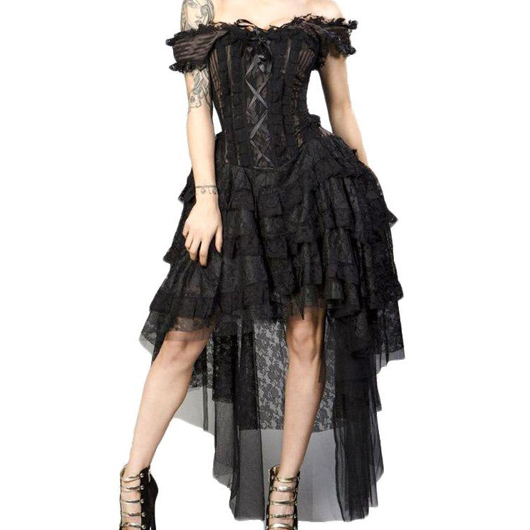 • Cascading Black Lace Drama: The cascading black lace skirt section adds a touch of drama and intrigue to the dress. The flowing lace creates a beautiful waterfall effect that flatters your figure and injects a touch of whimsical mystery.