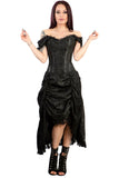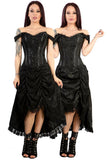 Passion corset dress in black satin and black satin lace overlay skirt with lace frill around. Black matt corset details and lace fastening on the back. Perfect for special occasions. Unleash your dark side with that gorgeous off shoulder dress.