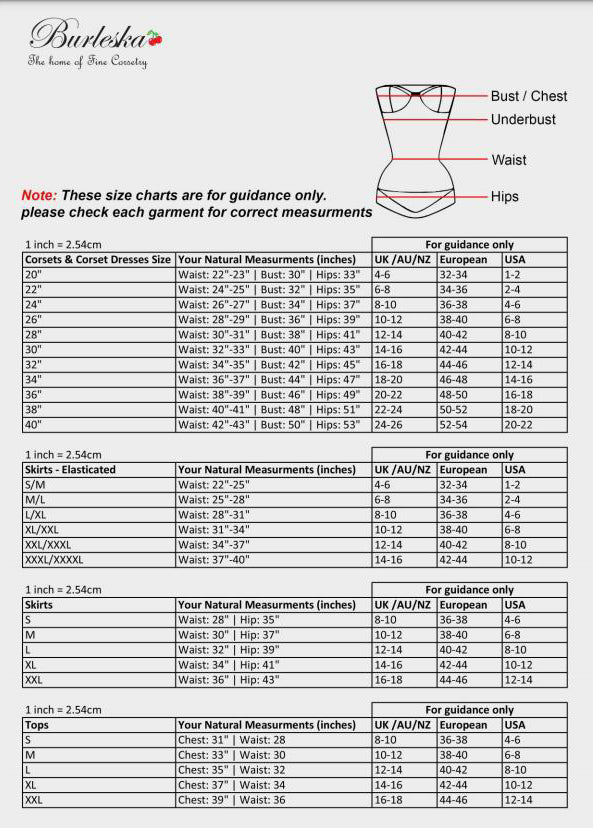 Please note this dress is sized in corset measurements - waist size in inches of the corset dress when fully closed. It is generally recommended to order a size between 2 and 4 inches below your natural waist size.