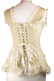 This is a Beautiful Bodice in Cream with Lace and corset lacing sixteen pairs of eyelets at back for corset lacing. The Modesty panel at back measures 5 1/2 inches 13.5 cm approx. Four bones at front and steel Binding supports at back (Back Lacing)