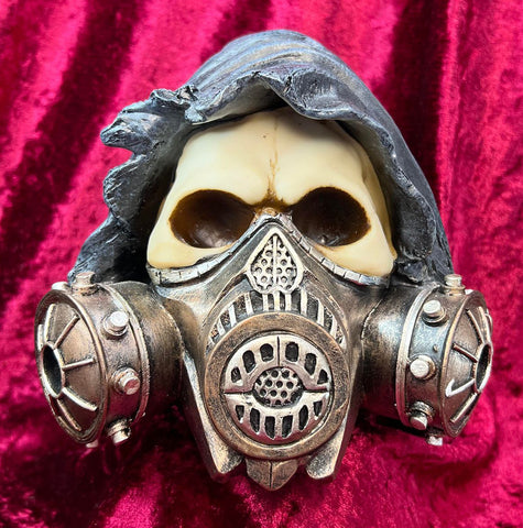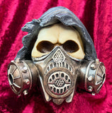 With a dark jagged hood and a thick gas mask covering the majority of the face, this skeleton wishes to remain unidentified. Cast in the finest resin before being expertly hand-painted, this skull is the perfect addition to any gothic collection.