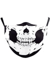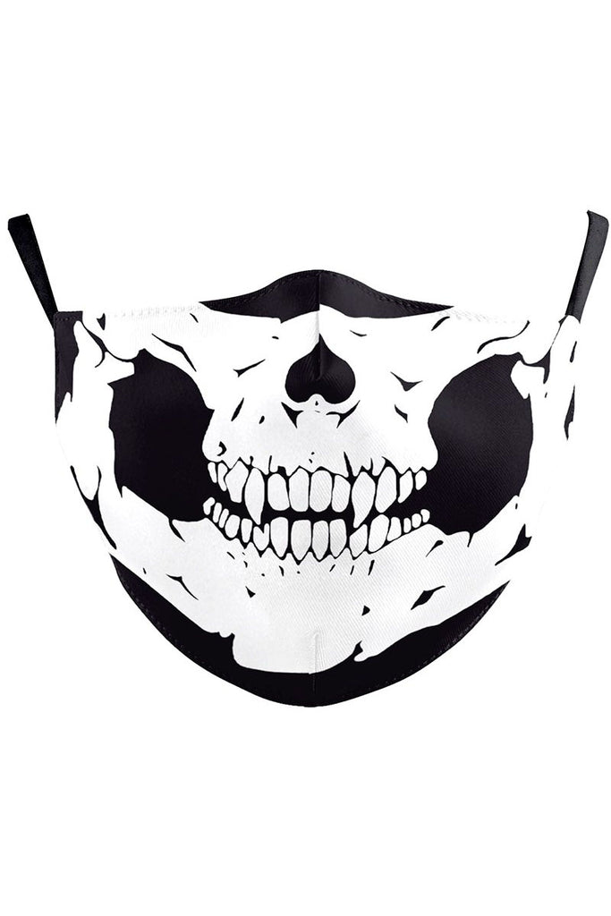 An adjustable, double-layered face covering with filter opening featuring a classic skull design. Protects against wind, dust, and other airborne particles and is useful for preventing the spread of viruses such as COVID19. Wash after every use. Non-medical.