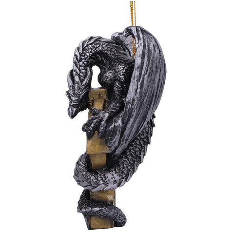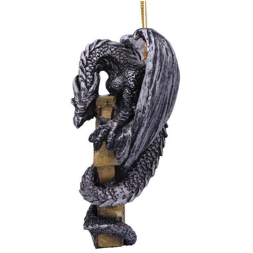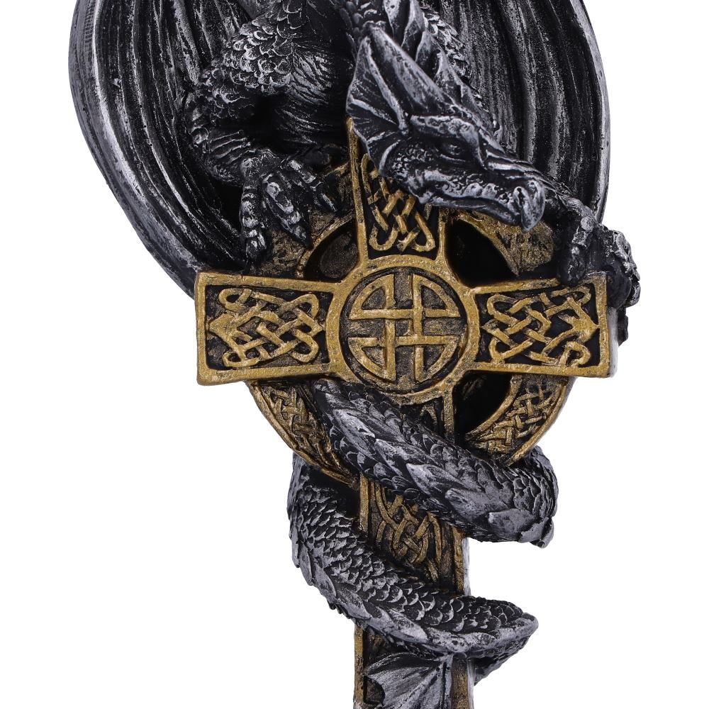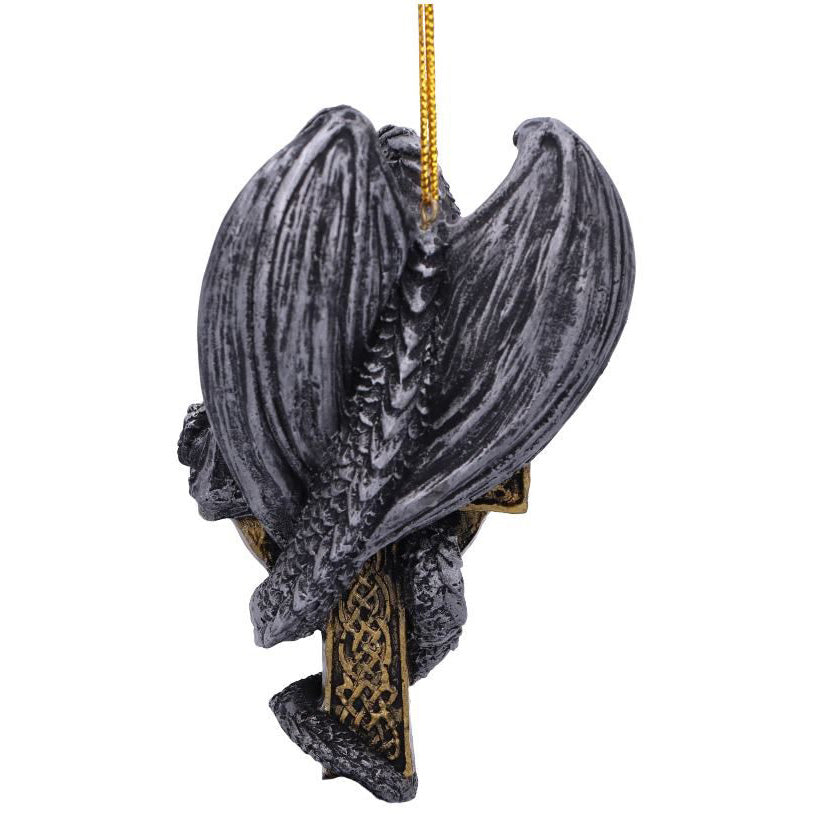 Suspended from a golden thread, this beautifully crafted Dragon coils around his treasured metallic golden Celtic cross. Decorated with elaborate patterns, this piece would make a quirky festive accompaniment or would be perfect as a year-round piece of fantasy decor. Cast in the finest resin before being lovingly hand-painted this piece is perfect for those who have an affinity for mythical beasts.