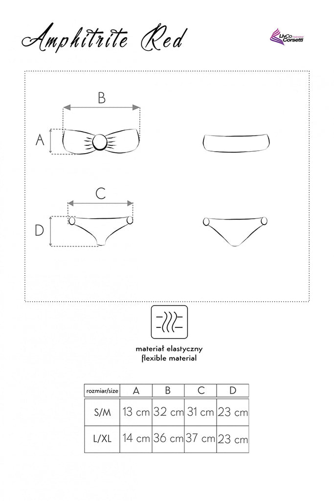 The two-piece swimsuit draws attention mainly due to the form of a balconette bra, its subtle character and an interesting use of circular connections between the back and front parts on the hips and between the cups. Ruffles of the material on the bra optically enlarge the bust and are a decorative element. The bra allows you to reveal your shoulders and back. The red that awakens the senses will emphasize unbridled temperament, feminine sensuality and strength.
