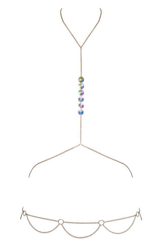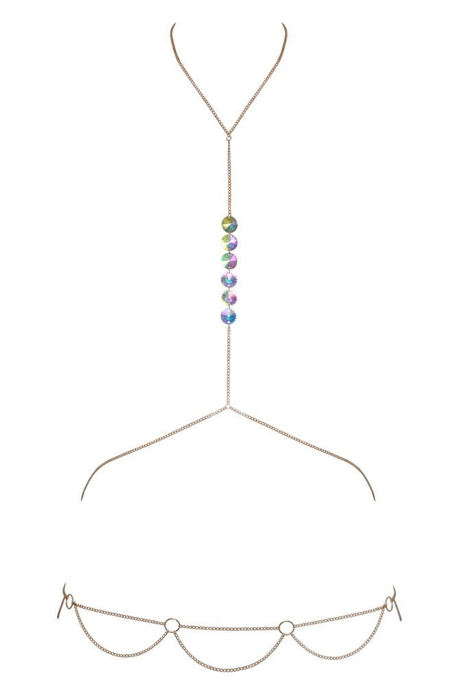 Dazzling Hologram Gems: The chain features six large, shimmering hologram gems positioned between the breasts. These gems catch the light and add a touch of dazzling glamour to the piece.