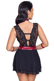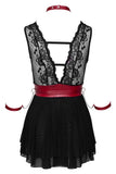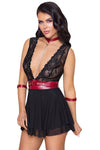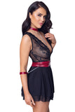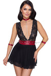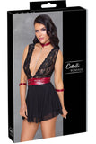 Discover the perfect blend of delicate and daring with the Cottelli Bondage Babydoll. This captivating piece is a stunning fusion of black lace and powernet, beautifully accented by a contrasting red matte-look insert that highlights the waist. The babydoll offers a powerful look with a playfully flared, double-layered skirt that creates an alluring silhouette.