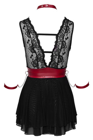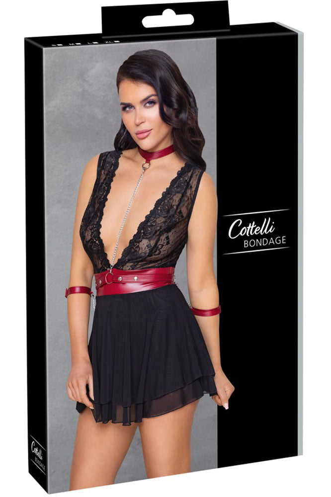 Every detail of this set is designed for versatility and confidence. The babydoll features a low-cut neckline at both the front and back for a seductive look. It includes a stylish belt and a matching collar, both crafted from the same striking red matte material. For a full bondage-inspired look, two restraints with snap hook chains are attached to the belt. Both the belt and the collar with its chain can be adjusted and removed completely, allowing you to customize your style. The restraints feature hook-and-loop fasteners for an easy, secure fit that you can put on or take off in a moment.