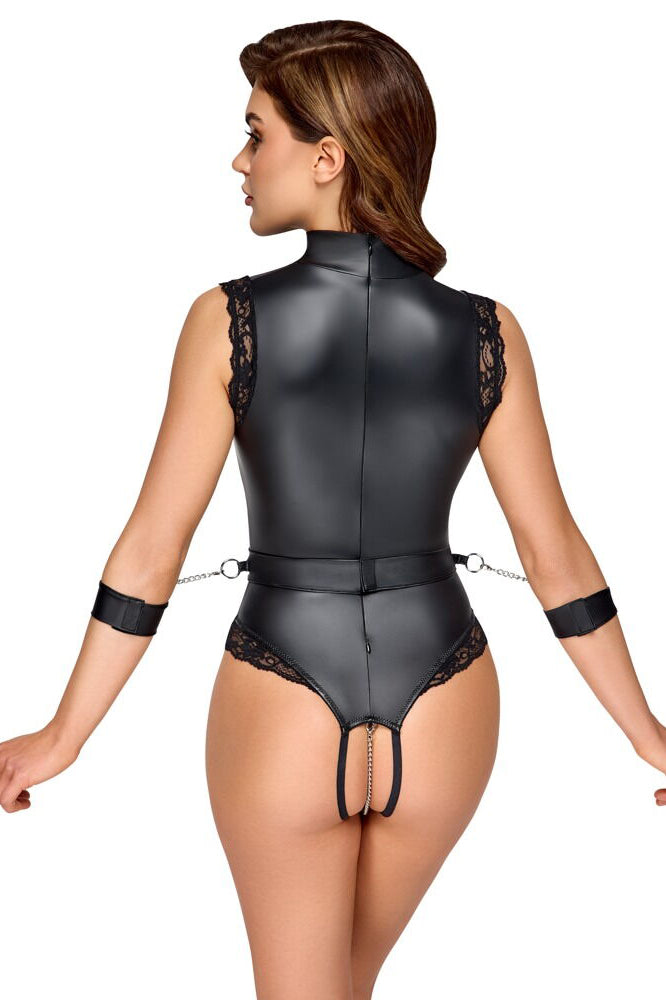 Every detail of this body is crafted to empower your intimate moments. It features a unique stand-up collar with a restraint ring at the front, adding a touch of sophisticated drama. The seductive open-cup cut-outs and a removable, stimulating chain over the crotch provide a daring, provocative look. Getting the perfect fit is effortless thanks to a long, carefully integrated 2-way zip at the back. The included, removable restraint belt, which can be adjusted with quick hook-and-loop fasteners, features rings for attaching the soft arm restraints. These restraints also have hook-and-loop fasteners for easy use, providing endless possibilities for captivating play.