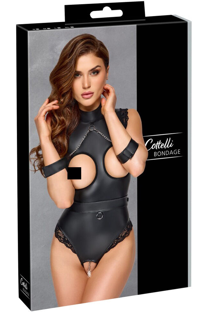 Make a powerful statement with the Cottelli Bondage Exposure Body, a piece designed for maximum allure and commanding confidence. This striking sleeveless, crotchless body combines a sleek, smooth black matte-look material with delicate lace accents at the arm and leg holes, creating a beautiful contrast in both texture and style. Silver-colored accessories add an edgy touch to the captivating design.