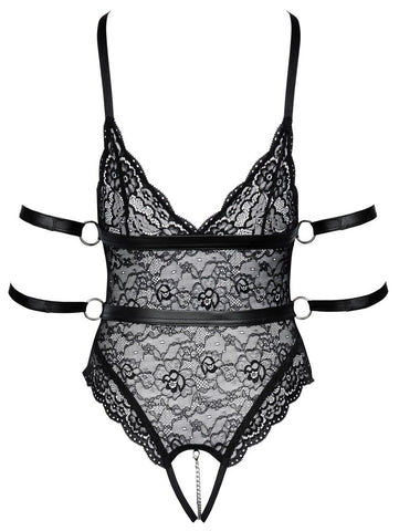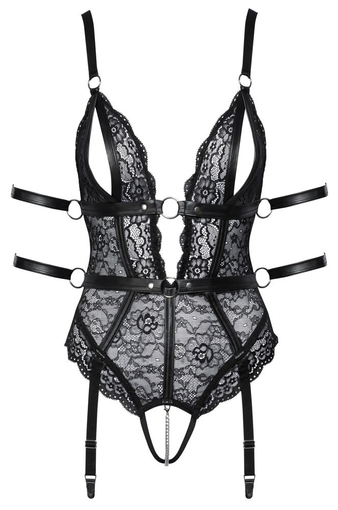The body features a daring low-cut front and back, leading to soft cups with seductive slits that beautifully frame the bust. For a touch of playful sensuality, a removable, stimulating chain cascades over the crotchless design. You'll find a secure fit with the sewn-on belts under the bust and at the waist, which feature decorative rings on each side. The four included restraints for the arms can be threaded through these rings, adding to the exciting harness-style look. The restraints are designed for ease of use, with quick-release hook-and-loop fasteners for effortless wear.