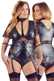 Explore a world of sensual adventure with the Cottelli Bondage Plus Size Body, a stunning piece designed for confident style and thrilling fun. This short-sleeve body is a captivating fusion of a sleek matte material and delicate lace, creating a look that is both bold and sophisticated.