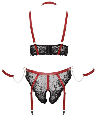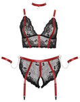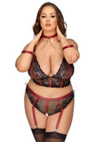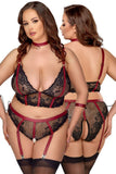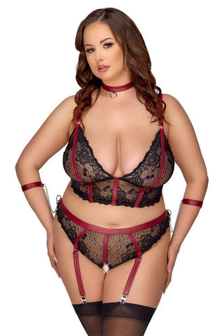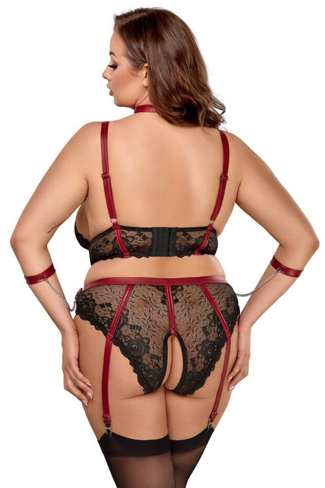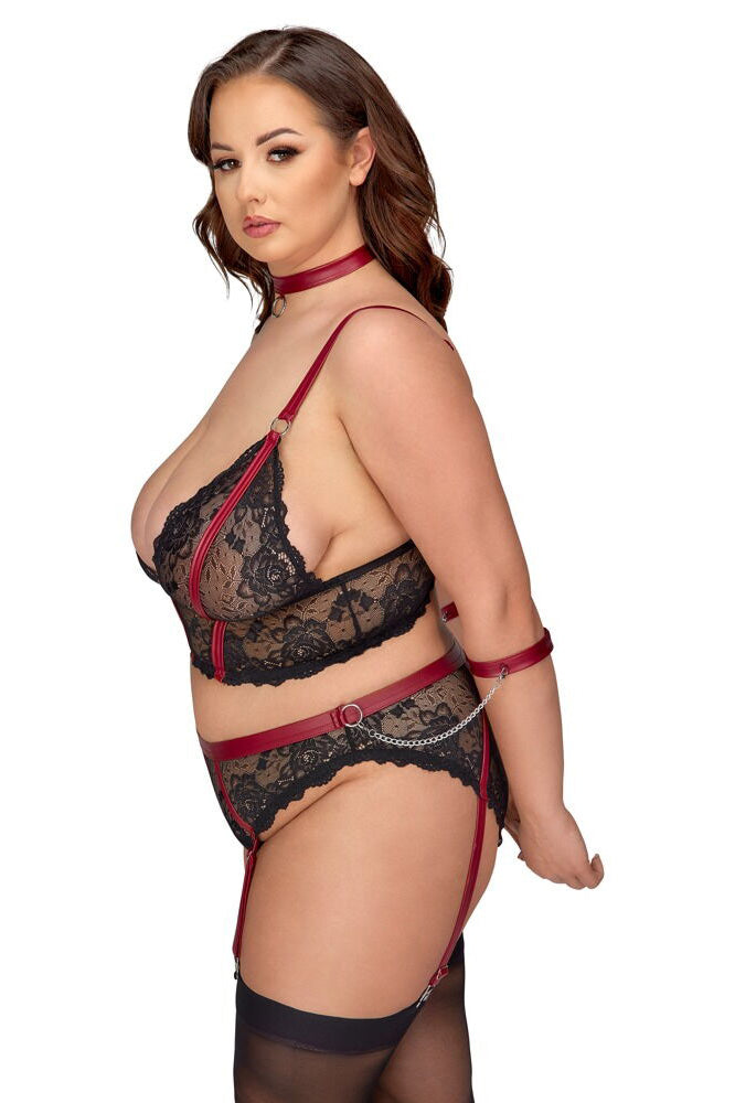This is more than just a lingerie set; it's a celebration of your curves and a statement of confidence. The Cottelli BONDAGE PLUS collection combines exquisite design with a secure, comfortable fit, ensuring you feel both captivating and empowered. Each piece in this beautifully crafted four-piece set features delicate black stretch lace accented with rich, contrasting red details, offering a sophisticated look that moves with you.