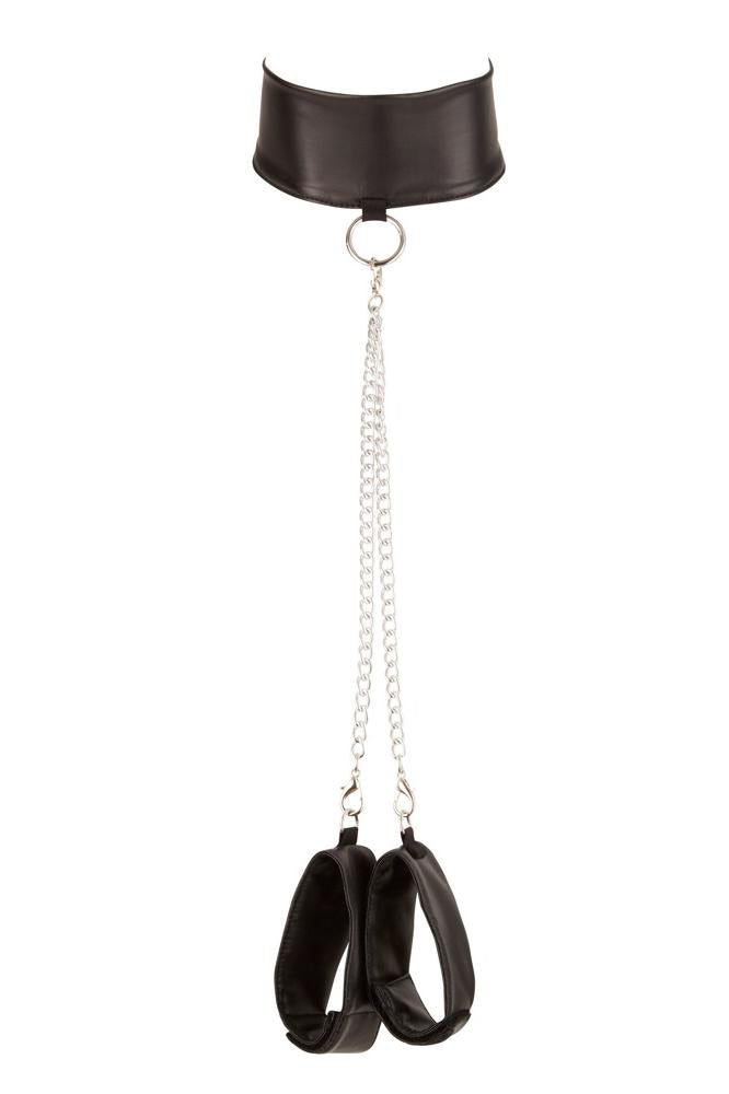 The set's true power lies in its included accessories: a pair of handcuffs and a matching choker. Both have convenient hook-and-loop fasteners, and they are joined by a removable metal chain with snap hooks, allowing you to connect them for a dramatic look or wear them separately.