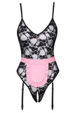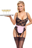 Playful Details: Small pink buttons at the neckline and a matching pink tie-up apron complete the classic maid look with a modern, sensual twist.