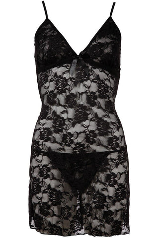 The perfect set for seduction! Slightly flared chemise made out of floral lace with a decorative strap underneath the breasts. With a matching string.