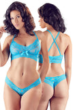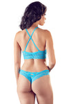 Delicate lace in a trendy cut! Soft bra and briefs made of soft lace. Bra with stretch straps that cross over the back. Briefs on the front and over the bottom with crossed stretch bands.