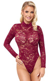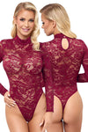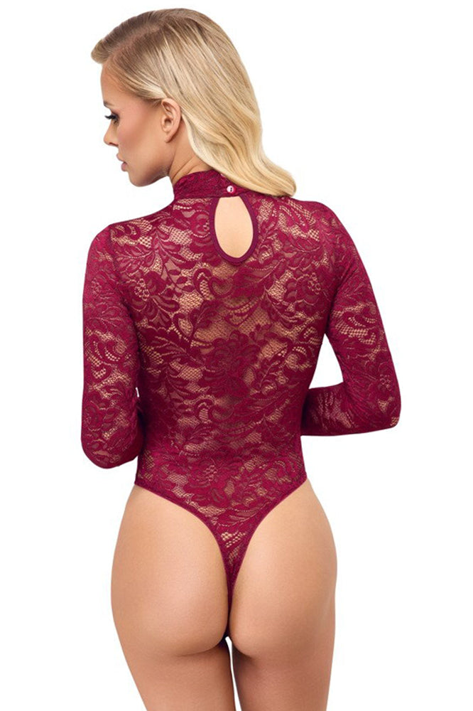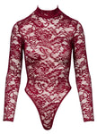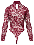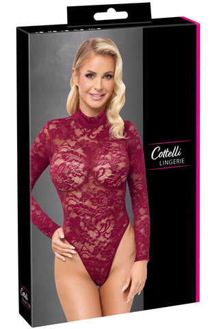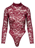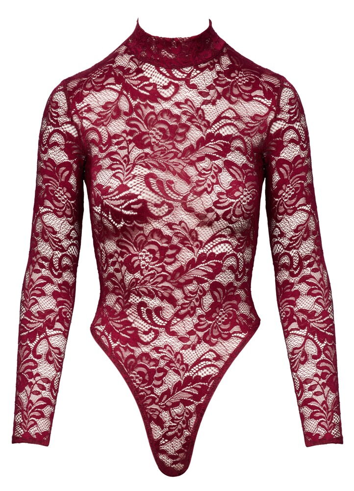 Exquisite ornamental lace in a sophisticated colour! Long-sleeved body from Cottelli LINGERIE with a small stand-up collar. Made entirely from fine ornamental lace in sophisticated Bordeaux red. Soft and stretchy all around for a high level of comfort. The thong style with extra high leg cut-outs shows off the bum and legs perfectly. With press stud fastening at the crotch - practical and seductive at the same time.