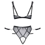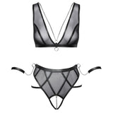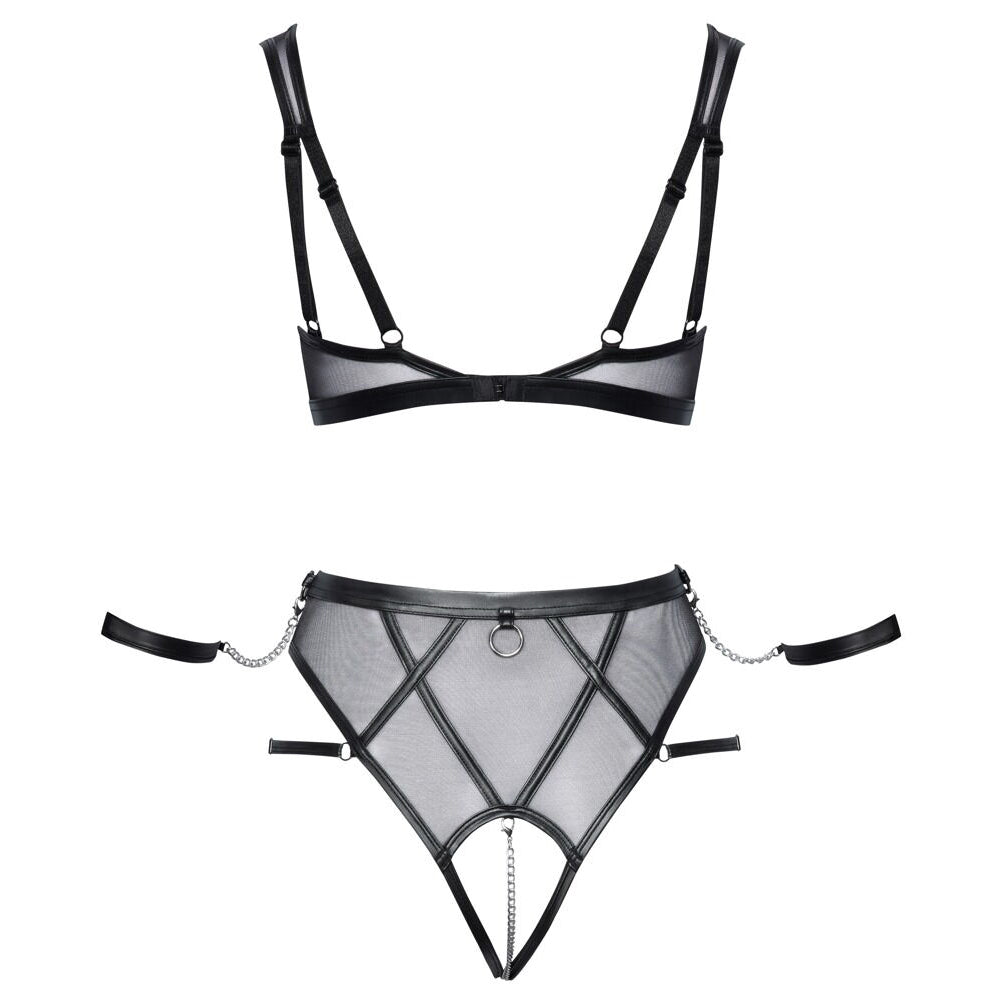 The set begins with a comfortable wireless bra that provides support without restriction, featuring a decorative, removable chain in the cleavage for a touch of drama. A restraint ring at the front adds to the edgy style, while fully adjustable double straps and a customizable back fastener ensure a perfect, secure fit. The high-waist briefs continue the provocative design with a stimulating, removable chain over the crotchless area, inviting an exciting element of surprise. Side rings on the waistband offer multiple points of connection, allowing you to attach the included restraints for a truly personalized look.