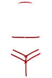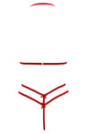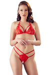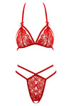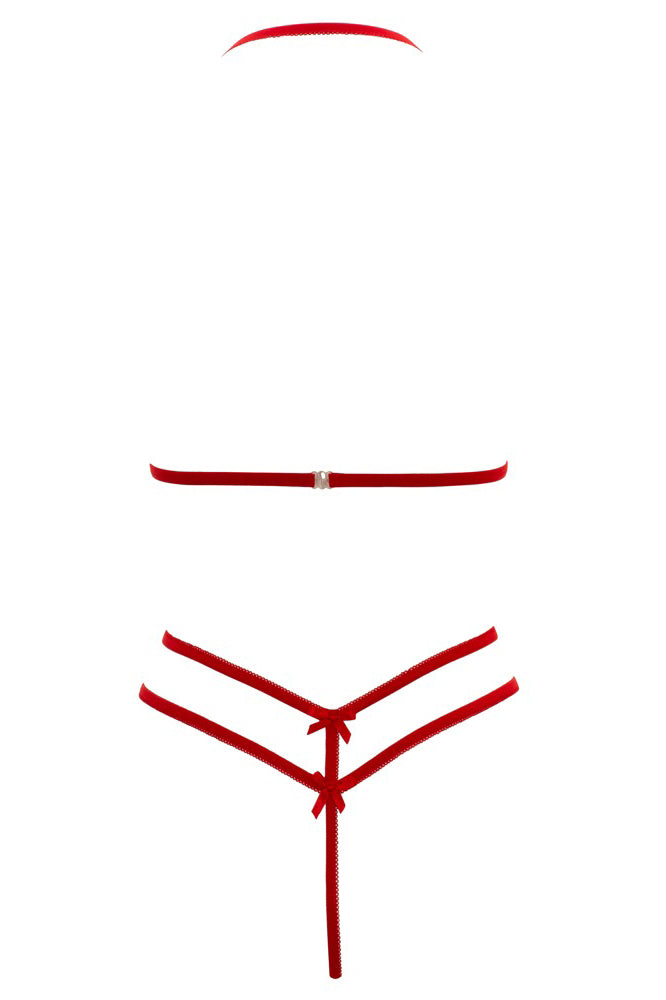 Delicate lace set! Wireless, halterneck bra with strap details and cups that can be folded down. The matching crotchless string has additional decorative straps.