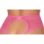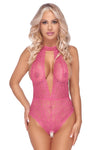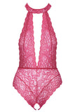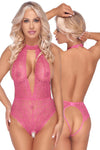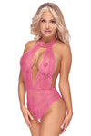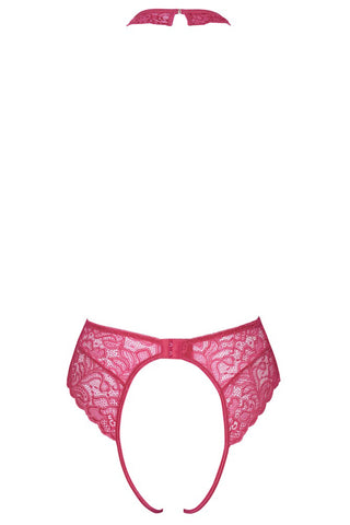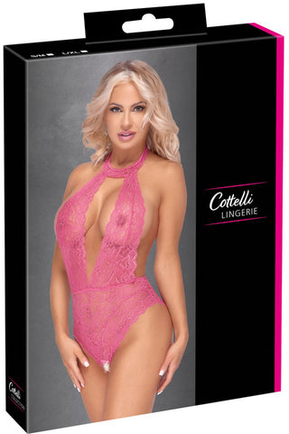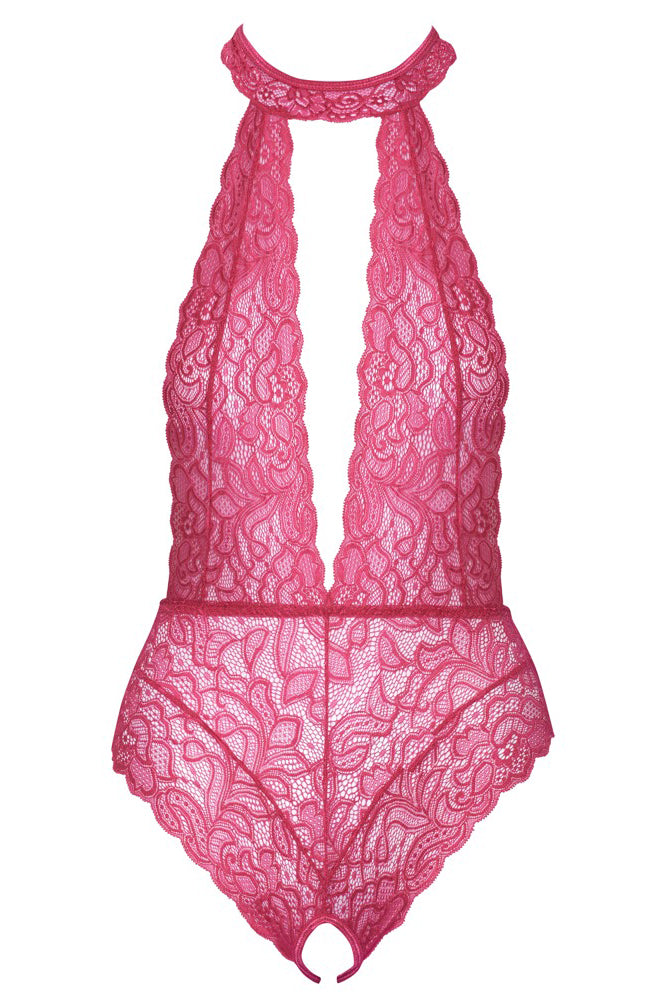 Exciting style in confident pink! Crotchless body from Cottelli LINGERIE completely made of delicate pink lace. Soft and stretchy for high wearing comfort. Front with deep keyhole neckline under the lace halterneck. Backless, halterneck with a clasp at neck. Completely open from through crotch to the hook fastening above the bottom.