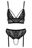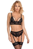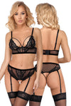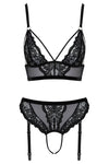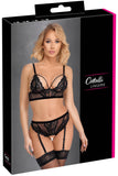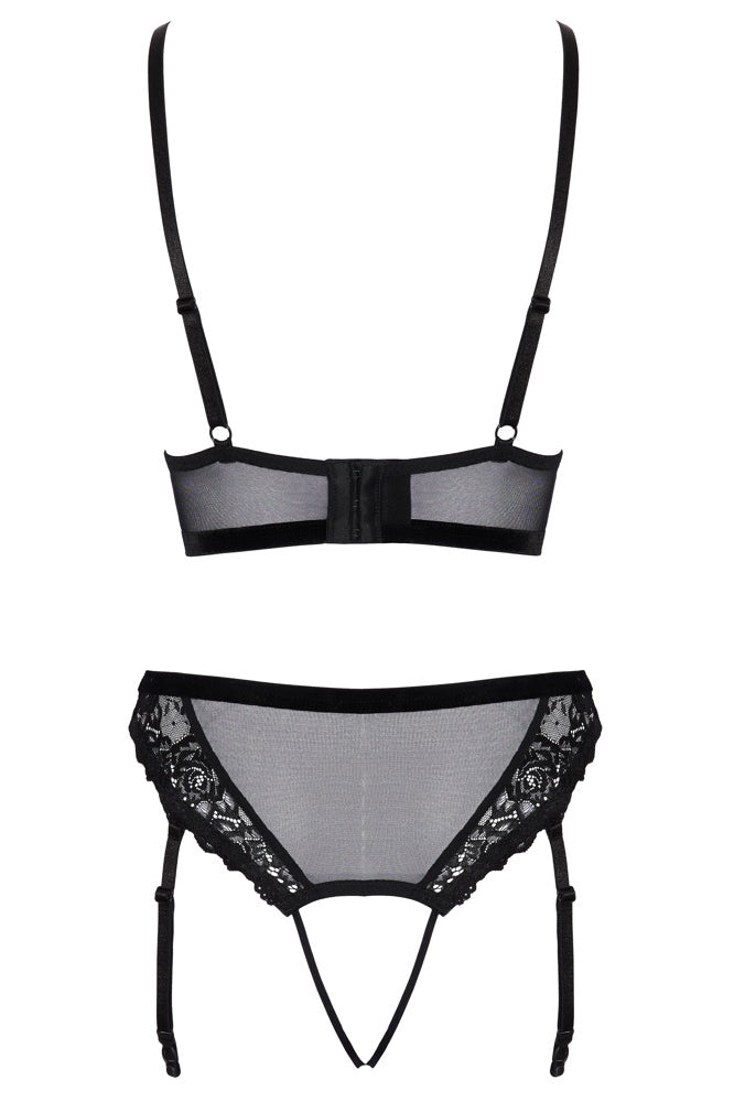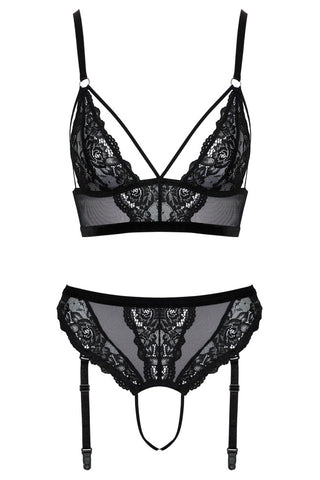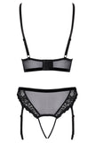 Seductive liaison of lace and powernet! Bralette and crotchless suspender thong set from Cottelli LINGERIE in a delicate mix of black lace and powernet. Soft and stretchy all around for high comfort. The longer-cut bra impresses with its stretch straps in the neckline, the waist-high thong with its completely open crotch. The straps are adjustable to fit, as are the suspenders, which are also completely removable from the thong.