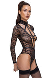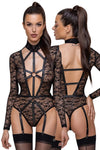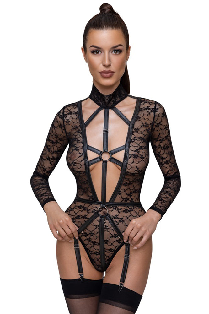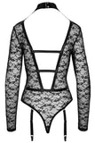 Delicate lace in a provocative style! The rio body with long sleeves from Cottelli LINGERIE is made entirely out of soft, delicate lace and has fancy matte look details. It is tight-fitting but also stretchy and soft which means that it is very comfortable. It has a low-cut neckline at the front and is open right to the belly button. The front has a provocative harness look with stretchy straps and rings. The body has a very low-cut back as well that is only held together by decorative stretchy straps. The lace collar is closed with 2 buttons at the back of the neck. There are press studs over the crotch. The suspender straps are adjustable and can be removed completely.
