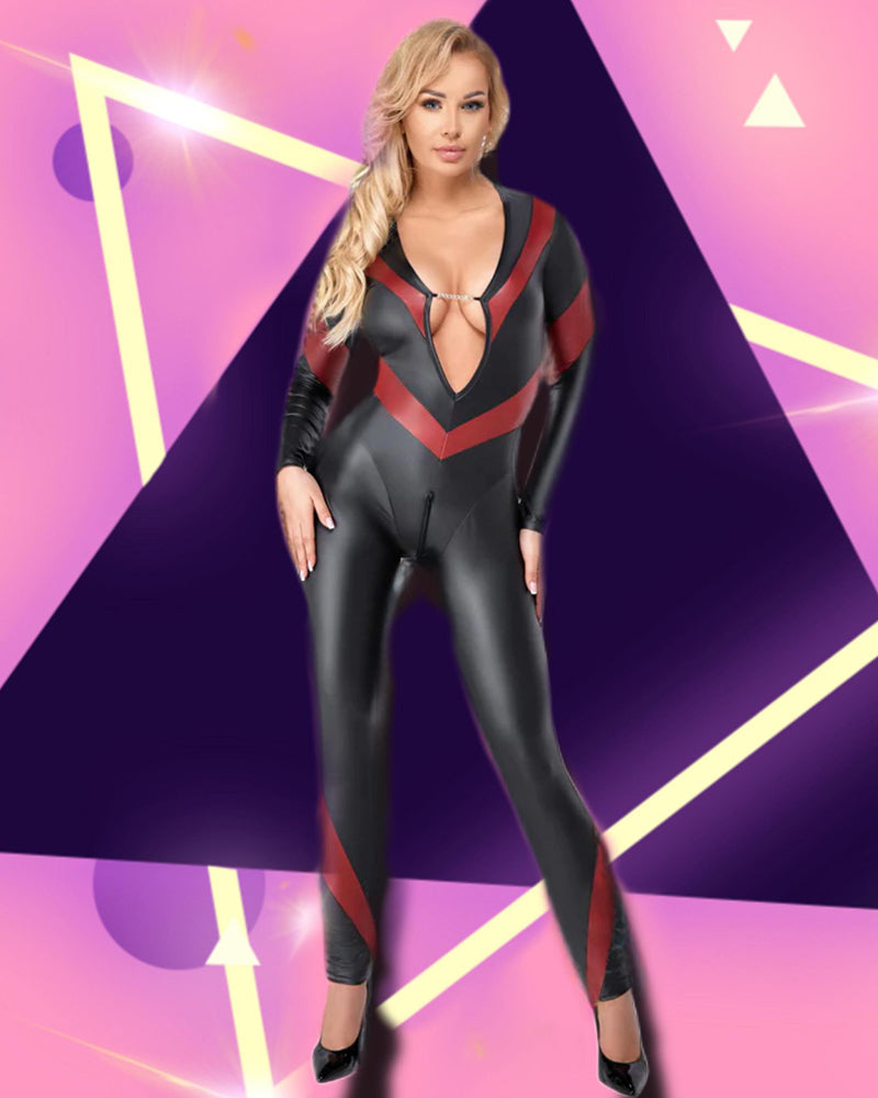 This jumpsuit is all about confidence and comfort. The skin-tight cut with long sleeves and skinny legs creates a streamlined silhouette, while the soft, stretchy blend of 90% polyester and 10% spandex ensures a high level of comfort that moves with your body. The front features a deep, low-cut neckline that plunges to the stomach, held together by a stylish silver-coloured chain for a touch of glamour.