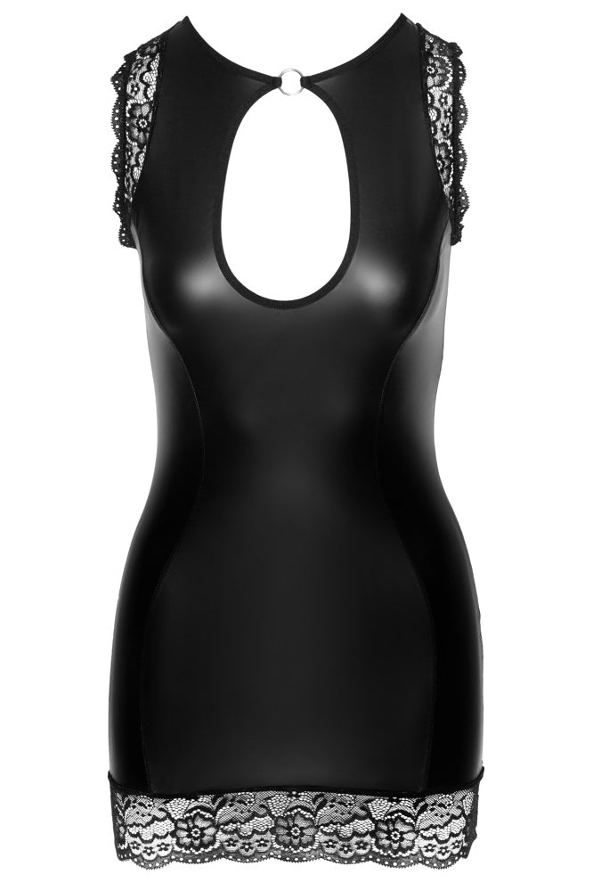 The dress's design is all about striking details. It features delicate lace trim around the arms and on the hem, adding a touch of elegance to the edgy look. A large, round cut-out at the cleavage and another at the top of the back provide exciting glimpses of skin, while a decorative ring at the front brings all the elements together. A secure clip fastener at the back of the neck ensures a reliable fit.