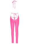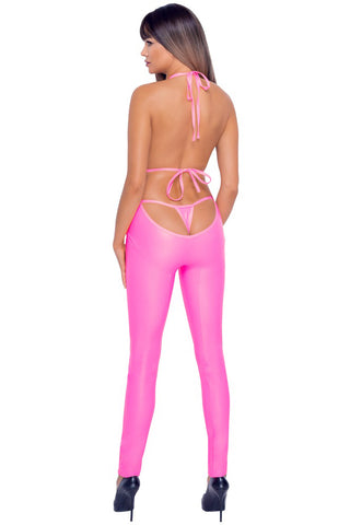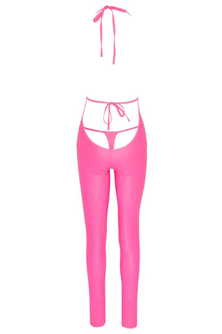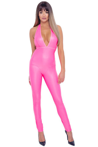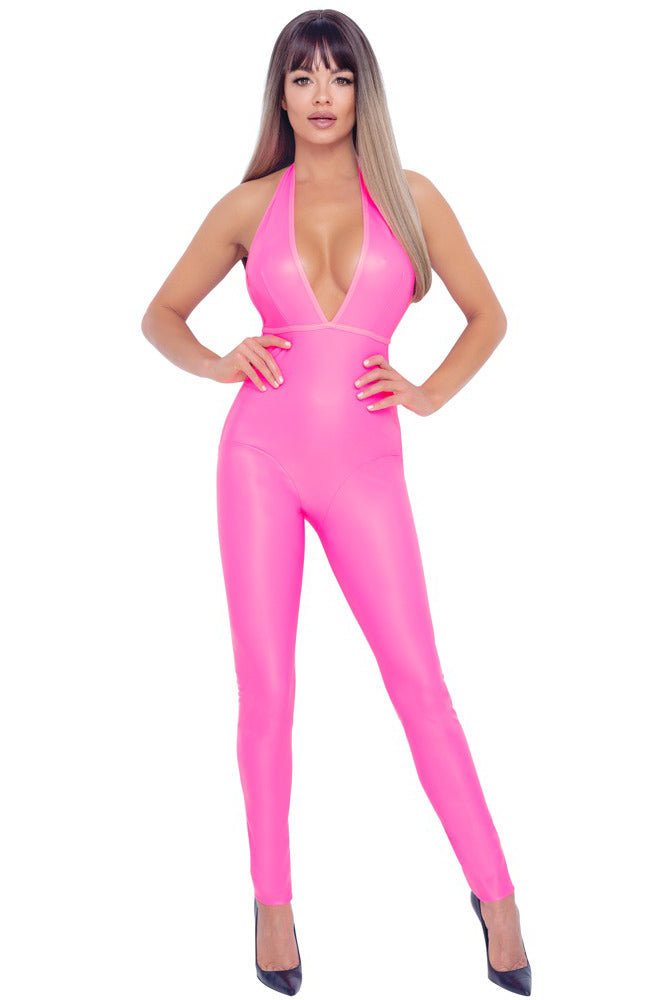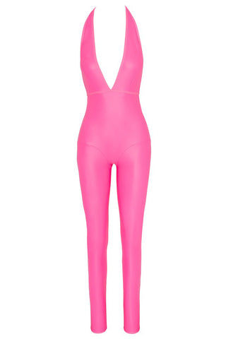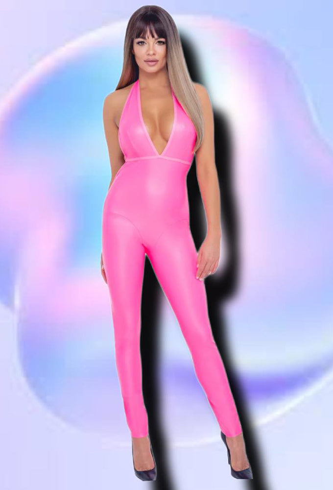 The design features long, slim legs that create a sleek silhouette, while the low-cut neckline plunges daringly to the navel. The halterneck and a single waist strap tie at the back, leaving the back almost entirely open for a dramatic and alluring reveal. Made from a soft and stretchy blend of 90% polyester and 10% spandex with a polyurethane coating, this jumpsuit guarantees both a perfect fit and high comfort.