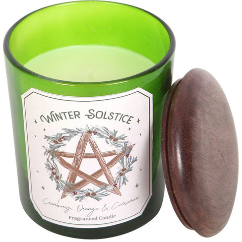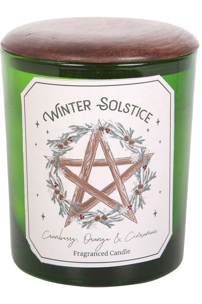 This lovely rich green glass candle with a wooden lid is fragranced with notes of Cranberry, Orange and Cinnamon and features a pretty Winter Solstic wreath and pentagram design. The candle can be used to decorate the home for Winter Solstice, the ancient pagan holiday known for traditions and rituals that celebrate nature, rebirth, transformation and the oncoming season.