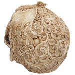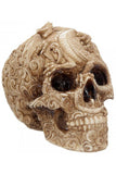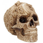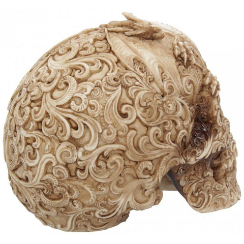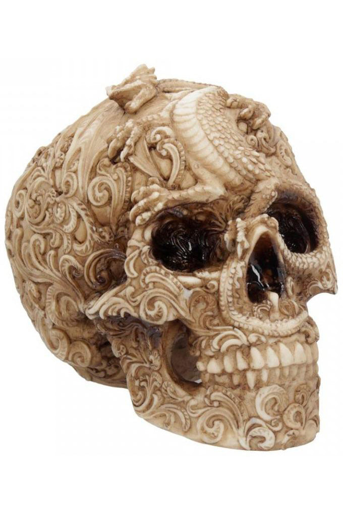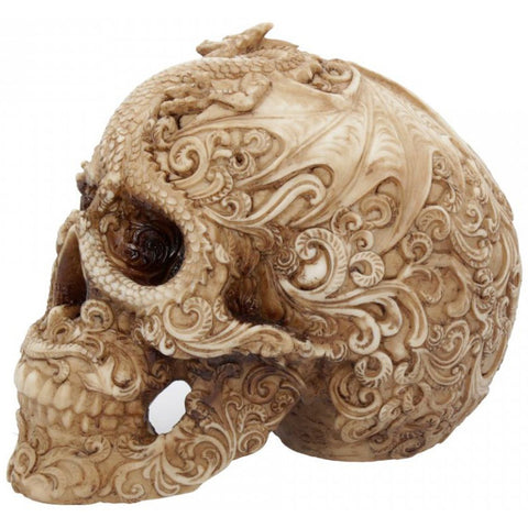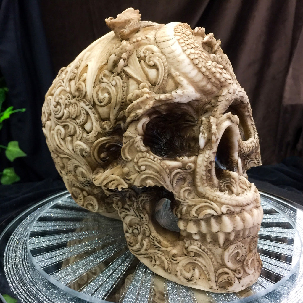 This skull brings unique beauty to any room. The skull is engraved with a large Dragon, along with baroque patterns. Cast in the finest resin before being hand-painted, this piece is great for any Gothic Fantasy lover!