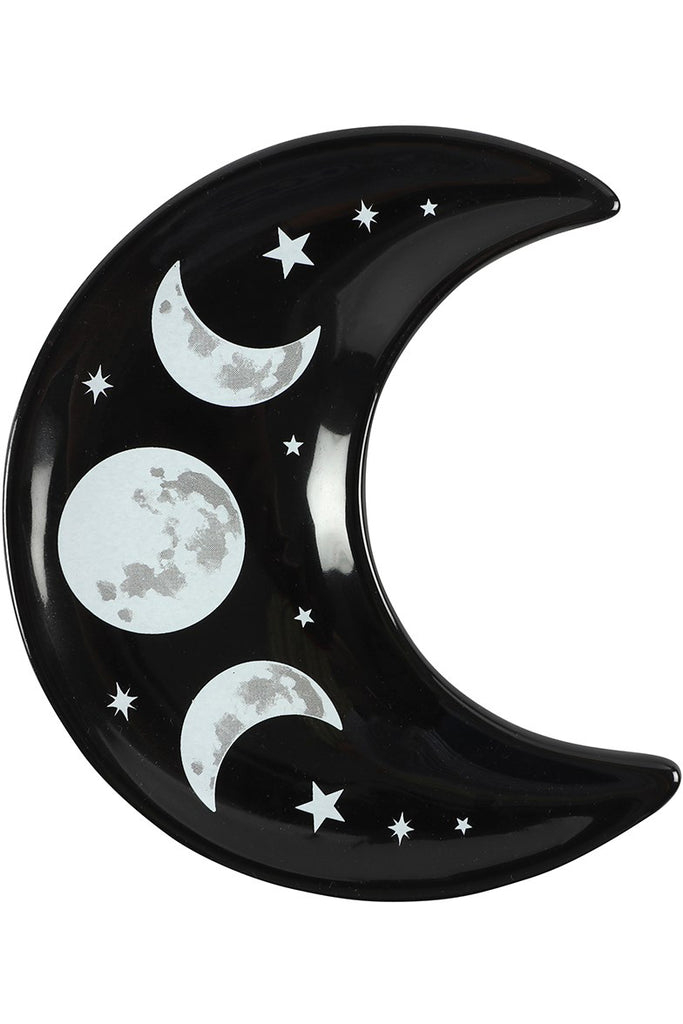 This ceramic trinket dish is shaped like a crescent moon and features a cool triple moon design. Ideal for holding jewellery and other small accessories.