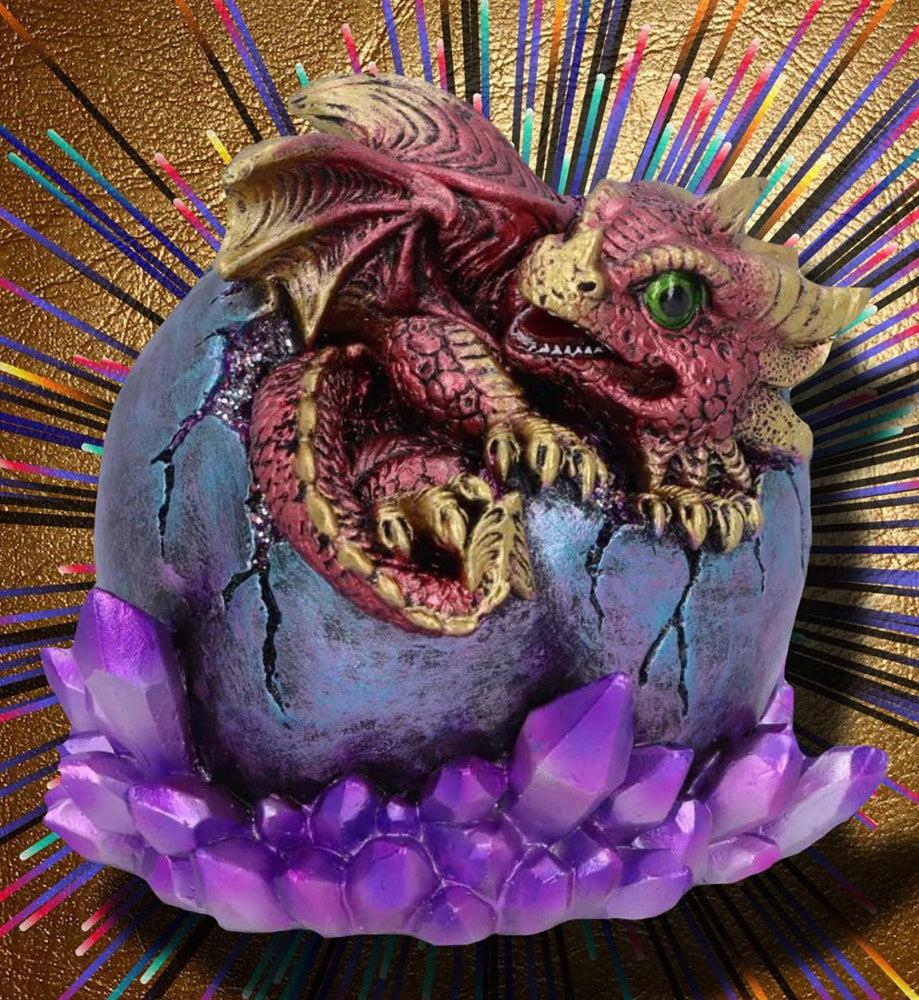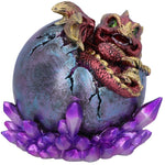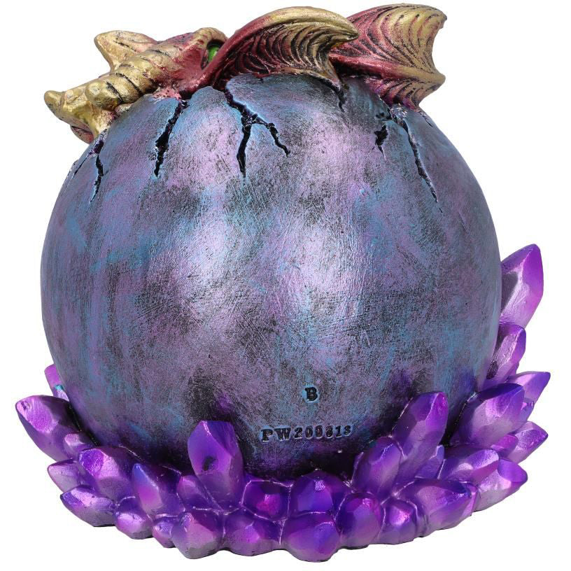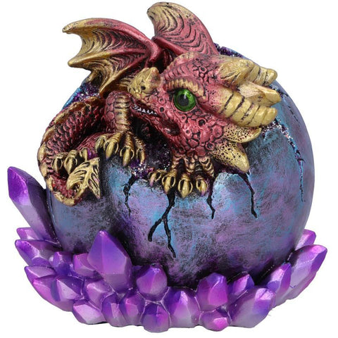 Watch as this wide-eyed creature emerges from its shell into this unfamiliar world. Featuring bright-red scales with golden accents on their claws, horns and wings, this enchantingly adorable dragon is looking into the world for the first time from its metallic purple home. Cast in the finest resin before being expertly hand-painted, this is the ideal gift for any lover of mythical beasts!