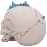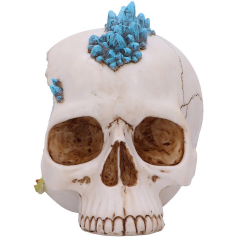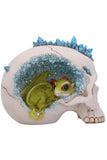Nestled into the side of a human skull, a green dragon can be seen lying amongst the blue crystals embedded within. Which can also be seen protruding from the top of the skull. Cast in high-quality resin, before being expertly hand-painted this intriguing crystal cave skull is sure to take pride of placement at the centre of your geode or skull collection.
