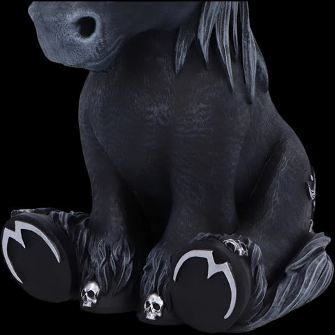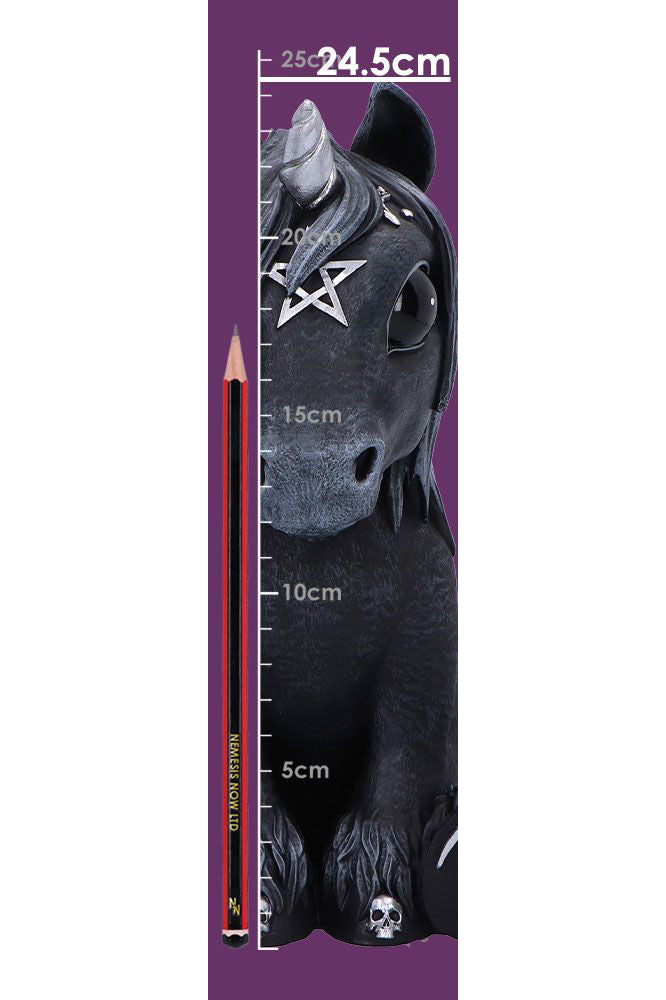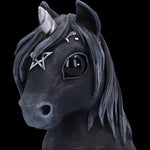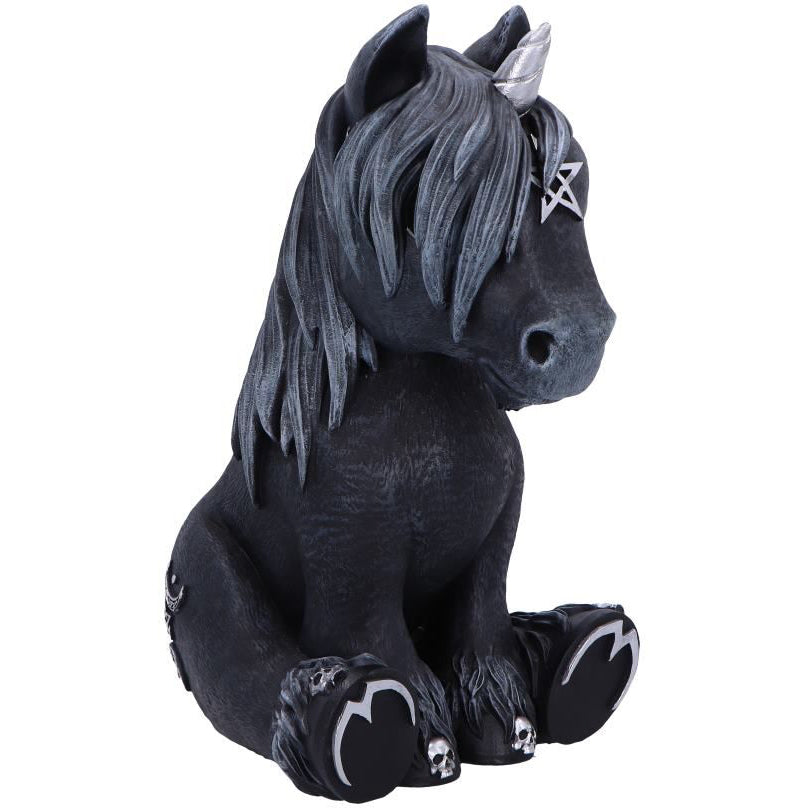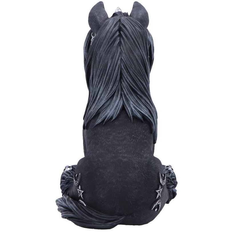 Cast in premium resin and finished by hand, Culticorn's flowing black mane, expressive eyes, and silver-toned horn are complemented by its dramatic flame-accented hooves, skull detailing, and an ornate pentagram adorning its forehead. Crescent moon motifs add an extra touch of esoteric charm, enhancing its mystical character. The layered textures and dark palette give the figurine a dimensional, collectible-quality finish.