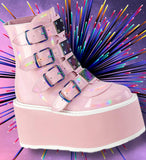 - Edgy Details with a Playful Twist: Quadruple buckle straps with gleaming metal plates adorn the front of the boot, adding a touch of punk rock hardware with a playful pink twist.