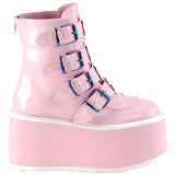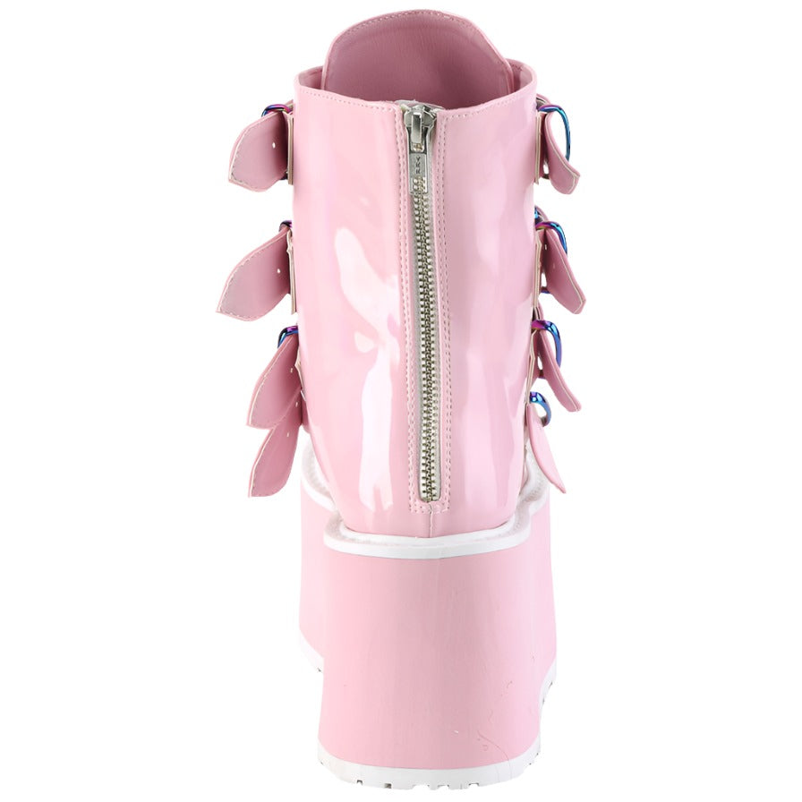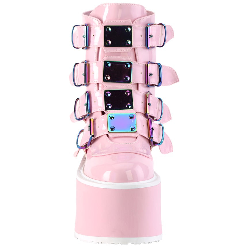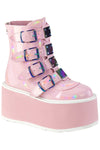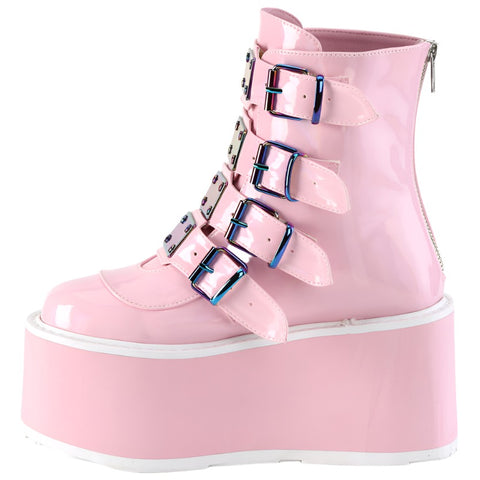 Embrace the playful rebellion of pink with the DemoniaCult Pink Patent Holographic DAMNED 105 Boots from Angel Clothing. These bold ankle boots boast a mesmerizing holographic finish that shifts and gleams with every step, perfect for those who crave a unique and eye-catching look.
