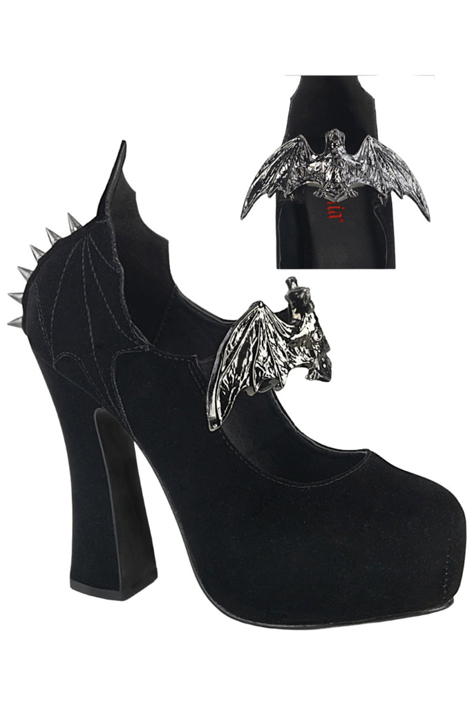 5" (127mm) Heel, 1 1/2" (38mm) Concealed Platform Slip-On Mary Jane Pump Featuring Elastic Strap with Large Metal Bat and Cone Spike Studded Bat Wing Detail on the Heel Cap.