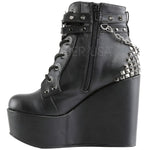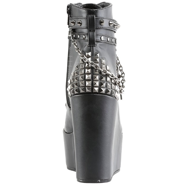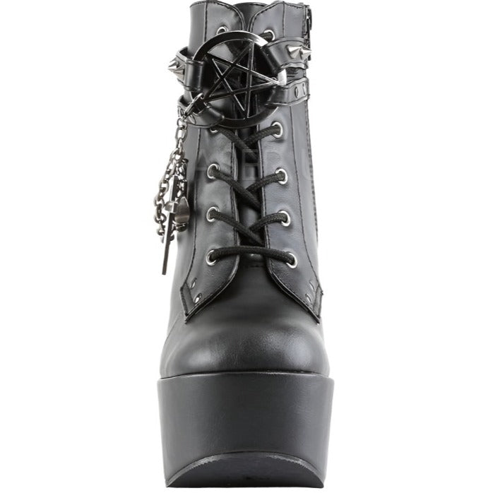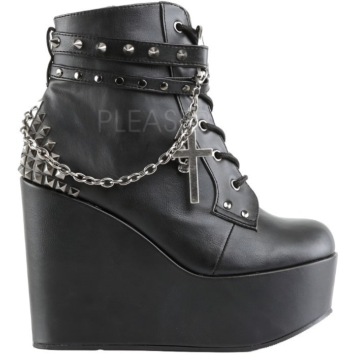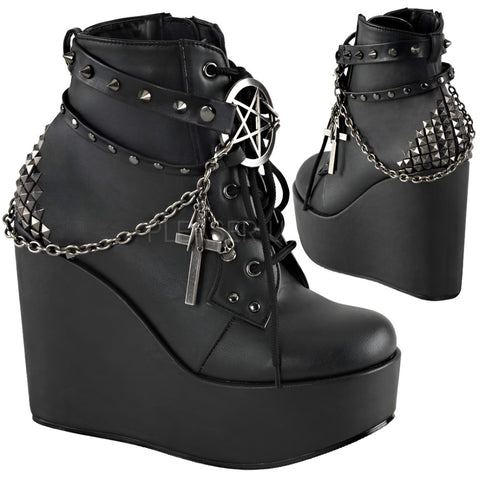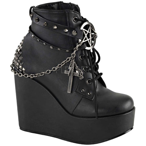 5" (12.7cm) Wedge Platform Lace-Up Front Ankle Bootie Featuring Wrap Around Studded Straps with Pentagram Detail, Chain with Charms of Cross, Skull Head, Lightning, Safety Pen and Pyramid Studs at Back, Inside Zip Closure.
